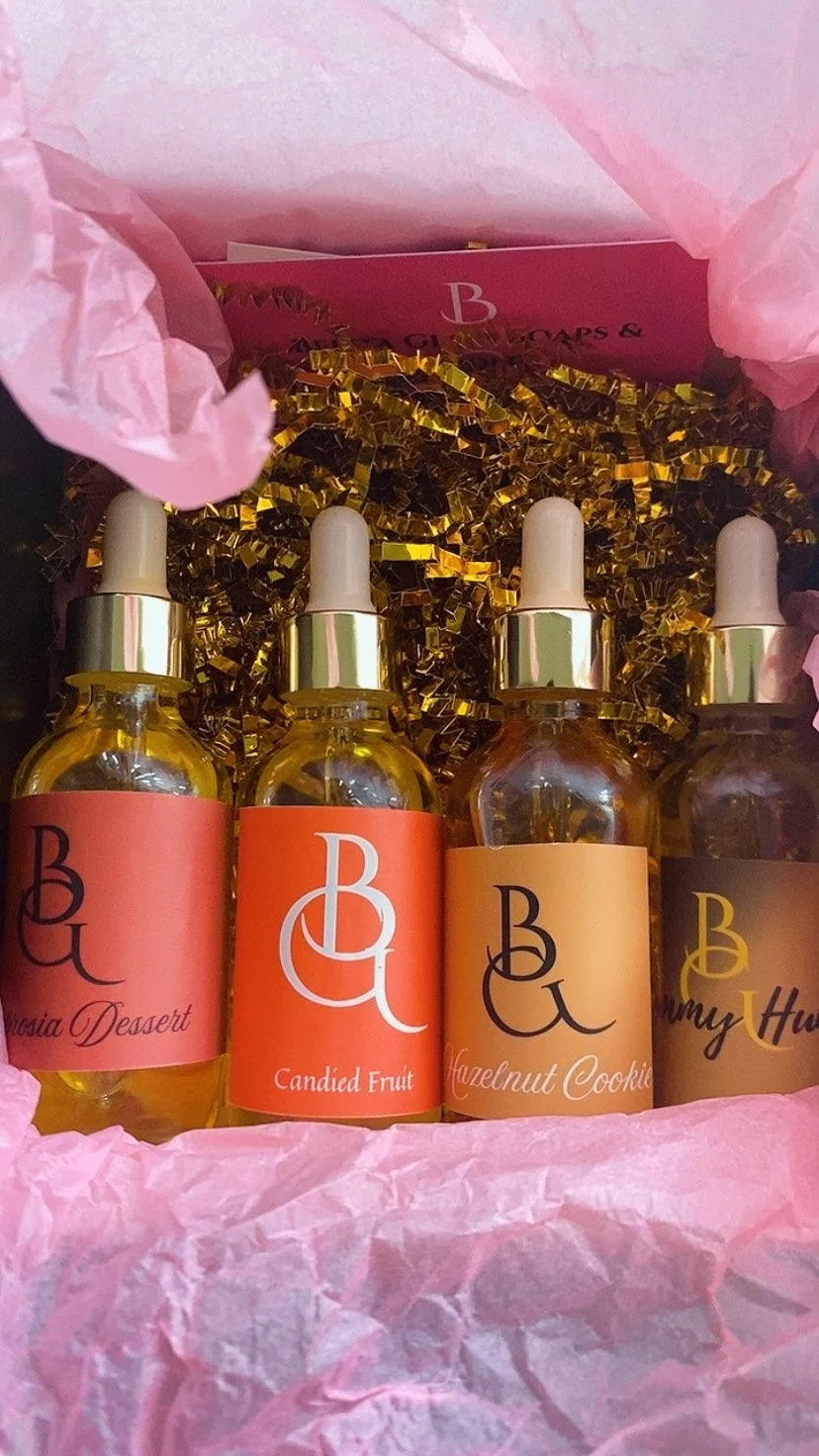 This is a ONE OF ONE! Giftset featuring four of your favorite perfume body oils: Ambrosia dessert, candied fruit, hazelnut cookie, and yummy honey!